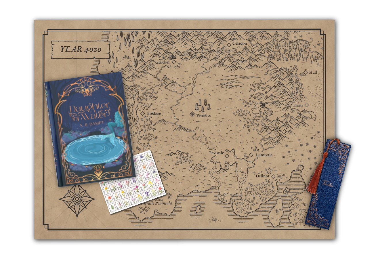 The Daughter of Water Kit includes: a Verdélian map designed by the author, floral stickers that will help you use the magic of flowers as the Verdélians do, and a blue leather bookmark with copper stamping of "Daughter of Water" in the ancient tongue.